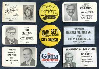 Harvey W. May Jr. was first elected to the Cumberland City Council in 1982, and was re-elected to that position in 1986, 1990, 1994, and 1998. He retired from public office in 2003. In 1986, and with the slogan “Your Voice in Annapolis”, May made an unsuccessful bid for election to the Maryland House of Delegates, District 1-B.