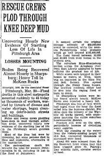 Pittsburgh, Mar. 20—Flood deaths in this steel metropolis mounted suddenly to 45 today as thousands of workers, worried by threats of disease and water shortage, began cleaning up debris-laden streets and buildings.